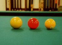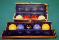 | ・使用台 四つ玉台 ・使用玉 白玉2個(手玉) 赤玉2個 黄色玉2個 紫玉2個 黒玉(障碍球)1個 計9個 (図1) ・玉の大きさ 61.5ミリの四つ玉と同じ大きさか、65.5ミリの大玉 図2は左より大玉(今回使用したキャノン用の玉)、四つ玉の赤玉、ポケットの玉 で・でかい、そして重い大玉! ・持ち点 四つ玉の持ち点3倍ぐらいが目安。 ・円の大きさ 直径13インチ(約33センチ) 30センチで行う場合もある。 よくLPを使って線を引く。(図3) ・点の数え方 キャノンでは手玉が同色の玉2個もしくは赤白、赤2個と白1個にに当った時得点される。 点数は次のとおり。