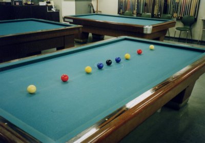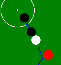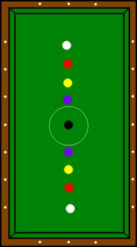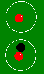 ※紫と紫10点は俗にムラムラ10点と呼ばれていたそうです。 上の得点パターン(本ボールとも言う)を当てれば続けて突けるのは他のキャロムゲームと同じだが、このキャノンゲームでは得点ショットのあとは、一回に限り「キャノン」と宣言すればどんな色の組合せ(黒玉を含む)でも2個当てればそのまま続けて突くことが出来る。但し「キャノン」は2回続けては出来ないので、「キャノン」の後は必ず得点パターンの玉を当てなければならない。(得点・キャノン・得点・キャノンの交互ならOKよ。念の為) 得点パターンの玉を当てられなければ突き手は交代する。 この時黒玉の位置が動いていたときは定位置(センタースポット上)に戻す。 またイニングの最初は上の5つの得点パターン(本ボール)から当てなければならない。 ・黒玉(障碍球) 円から黒玉を出した場合はペナルティを受けることになる。 但し、自分のインニング中に黒玉を戻すことが出来ればペナルティは受けない。 例 得点パターンで得点を得たときに黒玉も円から出てしまったら、次のショットを「キャノン」と宣言して黒玉を円の中に戻せば良い。(図5)勿論 得点パターン(本ボール)で得点しながら黒玉を円の中に戻しても良い。(図6) つまり自分のインニングが終わったときに(相手と交代した時)に円から黒玉が出ていたらペナルティを受けることになる ・黒玉がセンタースポットから移動している状態で交代した時、センタースポットが他の玉で占有されていた場合(図4の上) ロングライン上で円内のスペースの広い側にボールに接して置く。(図4の下) (個人的には色玉を定位置に戻す方法もあると思うが、確認できず) ・ペナルティ A 1回目は持ち点の80%増し 2回目は持ち点の60%増し 3回目は持ち点の50%増し 4回目以降はペナルティなし これが一般的。それ以外にも B 今まで取った点数がゼロに戻る。 C 障害点1が入る。障害点が3になったら(3回出したら)その時点で負けになる。 などがある。この辺はハウスルールか? ・あがり 先に自分の持ち点に達した人が勝ち。ジャストあがりや裏突きは基本的になし。 ・玉の配置 玉の配置はパターンAが一般的だが、店によってはパターンBの配置をする場合もある。 |