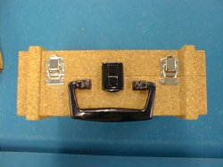内部より 中にはおなじみの東急ハンズで買ったスポンジシートがひかれています。 玉の重みで自然と窪んで、それによりふたを閉めた時固定されます。 |