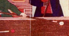 | 横浜居留地のビリヤード台第1号は横浜ホテルの火災(1866年)で焼失してしまいましたが、どっこい玉突き野郎はそんなことぐらいじゃめげません。いつのまにか新しい台が日本に到着しています。 明治になり横浜に新しい文化がどっと入ってきました。浮世絵師たちは好んでそれらの様子を描いています。これらは横浜開化錦絵と呼ばれ、庶民の間では大変な人気だったようです。 その中に明治3年頃三代目歌川広重が横浜居留地の風俗を描いた「異人玉ころがしの図」という作品があります。 港町横浜らしく窓の外には海。辮髪の中国人もいます。右側の窓に屋根が見える事から、この部屋は二階でしょう。その屋根の位置、またコロニアル・スタイルのベランダがあることからみて、この建物はインターナショナルホテルではないでしょうか。インターナショナルホテルは1870年に「ジャパン・ヘラルド・ディレクトリー」に広告を載せましたが、それにもビリヤード室があることを載せています。 ![]() 絵の中でキューを持っているのは9人!台の上の玉は赤玉5個、白玉5個 計10個!彼等はなんのゲームをしているのでしょうか? ピラミッド(スヌーカーの原型・15個の赤玉を使う)にしては白玉が多すぎますし、なによりゲームであるならば、玉を落すにしろ当てるにしろ構えている人のキューの先にそれらしい的玉がない事から (まして同時に突くなんて)、ただ玉を転がしているだけではないかと。 またこの台にはサイドポケットがありません。アメリカ製の台でしょうか? ![]() 四個穴のしかも大台(長さ約3.6M)がアメリカで流行したのは四つ玉6個穴台から四つ玉穴無し台に移行する間の短い期間(1863年から1869年ぐらい)です。インターナショナルホテル開業が1868年。おおっ!結構最新式の台じゃん。 ※この時期、横浜居留地ではコマーシャル・ホテル(1864年開業)コロニー・ホテル(1864年開業)ヨコハマ・ユーナイテッド・クラブなどにもビリヤード台がありましたが、台の種類など詳細は不明。 参考文献 横浜開化錦絵を読む 宗像盛久 編 東京堂出版 浮世絵大家集成 続第3巻 大鳳閣書房 ヨコハマ洋食文化事始め 草間俊郎 雄山閣出版 |