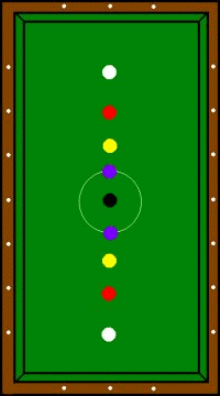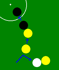※紫と紫10点は俗にムラムラ10点と呼ばれていたそうです。 上の得点パターン(本ボールとも言う)を当てれば続けて突けるのは他のキャロムゲームと同じだが、このキャノンゲームでは得点ショットのあとは、一回に限り「キャノン」と宣言すればどんな色の組合せ(黒玉を含む)でも2個当てればそのまま続けて突くことが出来る。但し「キャノン」は2回続けては出来ないので、「キャノン」の後は必ず得点パターンの玉を当てなければならない。(得点・キャノン・得点・キャノンの交互ならOKよ。念の為) 得点パターンの玉を当てられなければ突き手は交代する。 この時黒玉の位置が動いていたときは定位置(センタースポット上)に戻す。 またイニングの最初は上の5つの得点パターン(本ボール)から当てなければならない。 ・黒玉(障碍球) 円から黒玉を出した場合はペナルティを受けることになる。 但し、自分のインニング中に黒玉を戻すことが出来ればペナルティは受けない。 例 得点パターンで得点を得たときに黒玉も円から出てしまったら、次のショットを「キャノン」と宣言して黒玉を円の中に戻せば良い。(図5)勿論 得点パターン(本ボール)で得点しながら黒玉を円の中に戻しても良い。(図6) つまり自分のインニングが終わったときに(相手と交代した時)に円から黒玉が出ていたらペナルティを受けることになる ・黒玉がセンタースポットから移動している状態で交代した時、センタースポットが他の玉で占有されていた場合(図4の上) ロングライン上で円内のスペースの広い側にボールに接して置く。(図4の下) (個人的には色玉を定位置に戻す方法もあると思うが、確認できず) ・ペナルティ A 1回目は持ち点の80%増し 2回目は持ち点の60%増し 3回目は持ち点の50%増し 4回目以降はペナルティなし これが一般的。それ以外にも B 今まで取った点数がゼロに戻る。 C 障害点1が入る。障害点が3になったら(3回出したら)その時点で負けになる。 などがある。この辺はハウスルールか? ・あがり 先に自分の持ち点に達した人が勝ち。ジャストあがりや裏突きは基本的になし。 ・玉の配置 玉の配置はパターンAが一般的だが、店によってはパターンBの配置をする場合もある。 |