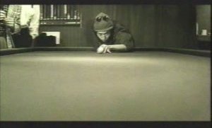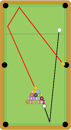 14-1のブレイク・ショットの入れ方映画の「ジェームズ・コバーンの新ハスラー」や小説の「凶手」 アンドリュー・ヴァクス著ハヤカワ・ミステリ文庫に出てくる14-1のブレイクでのコールショット。すでに発表している人がいたらゴメン! 手玉を空クッションから一番端の玉(「凶手」によるとコーナーボールと隣のボールの中間あたり)に強めに。 すると右の図でいうとフット・スポット上の1番ボールがツー・クッション後サイドポケットに落ちる仕組み。「凶手」の主人公は「五回に一回ぐらいは入る」みたいだが、撞球王が試すとせいぜい10回に1回ぐらい。 ほとんど確実性はないがお遊びでやるには楽しいかも。 |