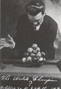 ビックリ人間登場!皆さんは掌の上にビリヤードのボール(ポケットね)何個落とさずに載せられますか? 私が試したら7個までは載りました。掴んで持ち上げるとなるとやっとこ5個かなぁ。 世界のビックリ人間の記録を集めたロバード・リプレーによるとジュリアス・B・シュースタさんという持ち上げ名人は20個のビリヤードのボールを片手で持つことができた。確かに写真を見ると片手の上にピラミッド状に積まれたボールがある!(1931.7.6撮影) またこの人は片手に25個のテニスボールあるいは野球ボールを載せることができるそうだ。やはりビリヤードのボールは表面がツルツルしている分難しいのか? 極めつけは平面上に置かれたビリヤードのボールを10個ずつ両手で持ち上げられる! ということは、この人がナインボールのラックたてる時、片手で充分? 参考文献 リプレーの奇人不思議館 訳 伴田良輔 河出書房新社 |